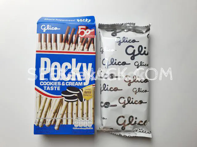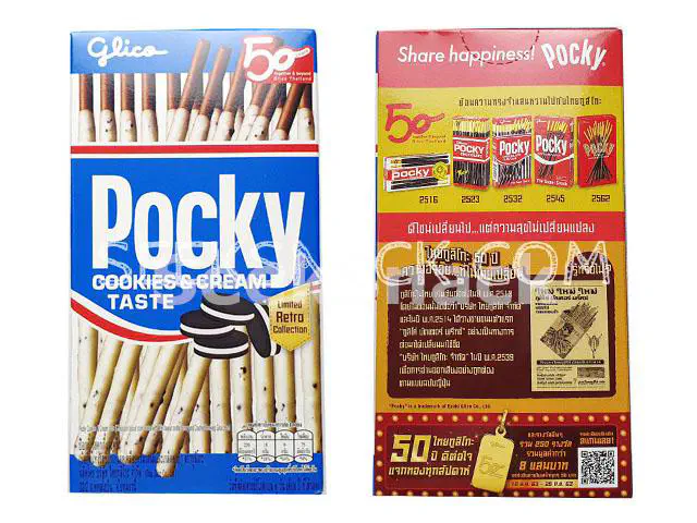 Pocky Cookies & Cream taste ( Chocolate biscuit stick coated with Milk flavour confectionery and Crushed Cookie) Glico brand Package limited Edition (Thai Glico 50th anniversaries) #