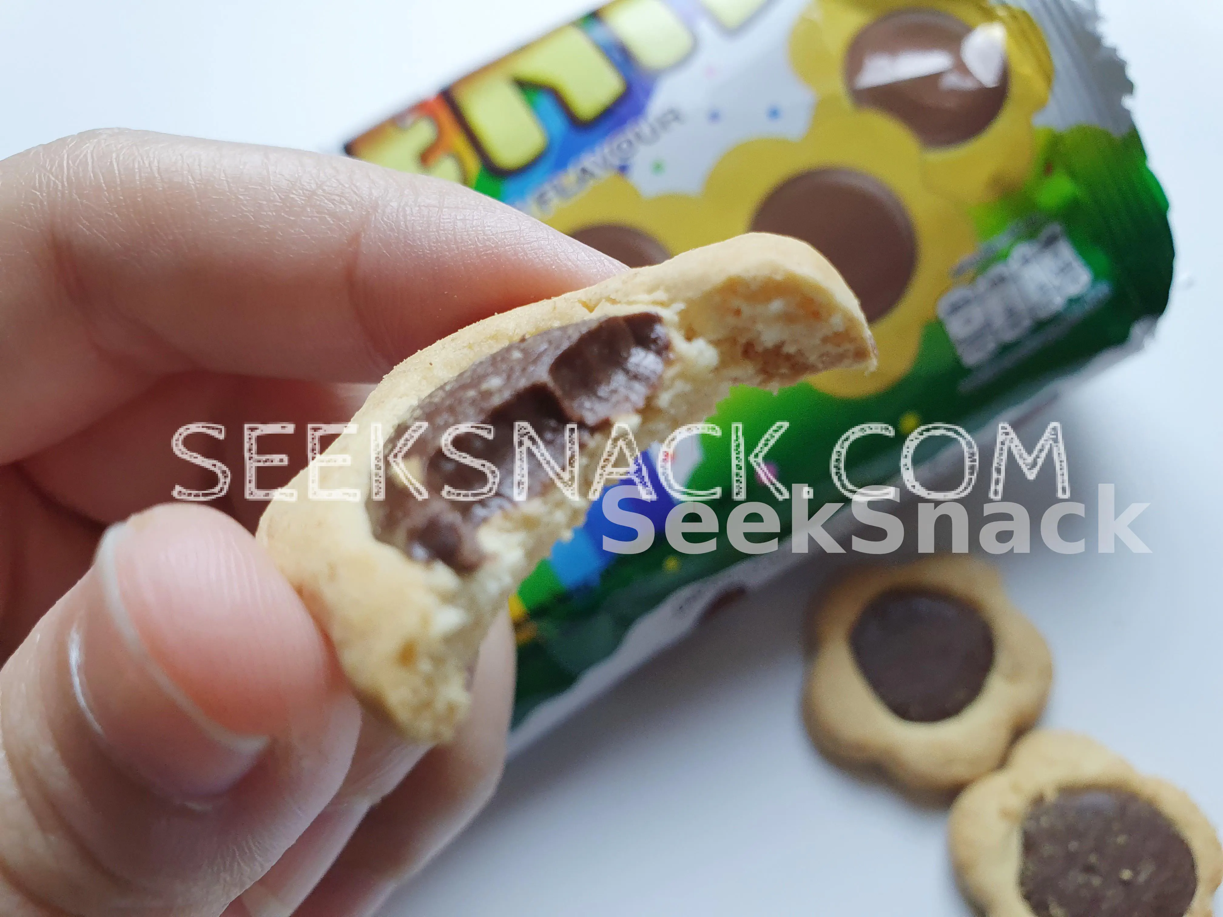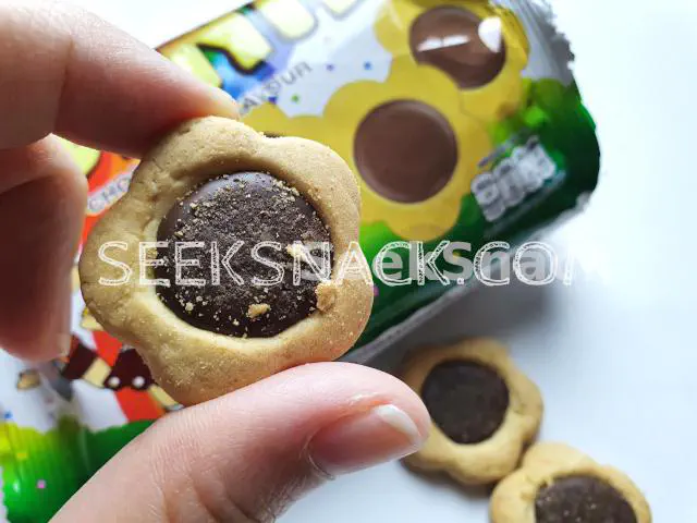 When open the package found flower shape biscuit, Delicious crispy taste and sweet from chocolate cream.