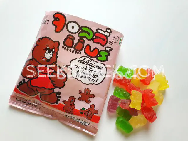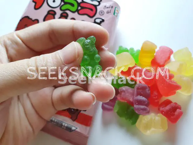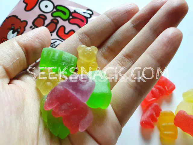Cute bear jelly (Jolly Bear brand) have 6 flavors (orange, grape, strawberry, pineapple and apple) with each color of bear representing each type of fruit.
