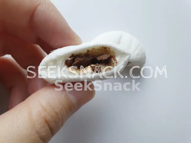 White marshmallow filled with chocolate, Marshamallow’s tasted is so sticy, few sweet and Chocolate’s taste so sweet. Overall taste when eat togeter is good.