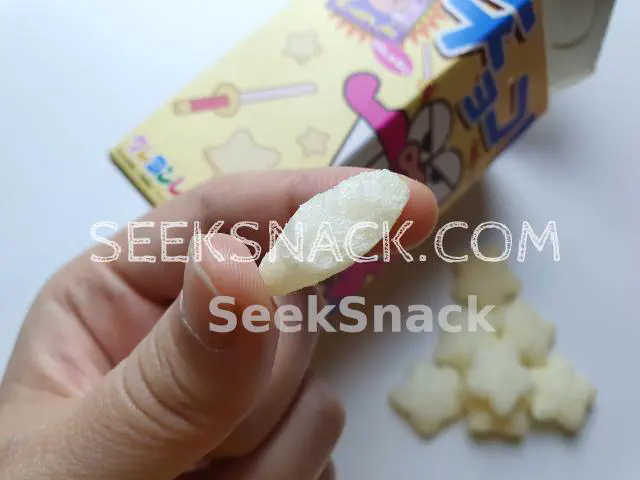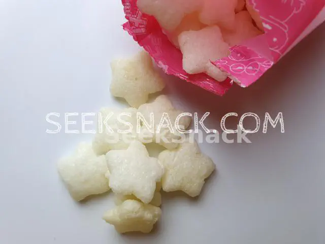 เปิดซองออกมาจะเจอกับขนมรูปทรงรูปดาวสีขาว มีกลิ่นอ่อนๆของนม เมื่อกัดเข้าไปจะสัมผัสถึงกรอบและรสชาติความหวานของนม